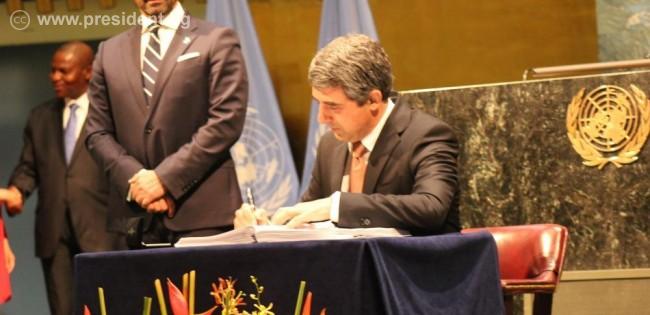 2016-04-22 18:39:00Държавният глава Росен Плевнелиев подписа за Република България Споразумението от Париж на страните по Рамковата конвенция на ООН по изменение на климата. Това се случи на официална церемония в залата на Общото събрание на ООН в Ню Йорк.