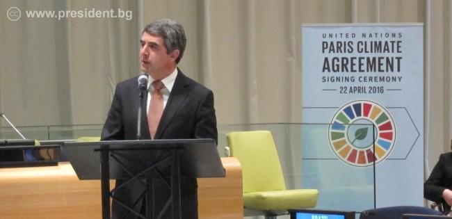 „Горд съм да потвърдя ангажимента на България за постигане на общите цели с подписването на този исторически документ. Сега всички ние трябва да предприемем решителни действия за скорошното му ратифициране и прилагане“, заяви българският президент в изказване в рамките на пленарното заседание относно климатичните промени.