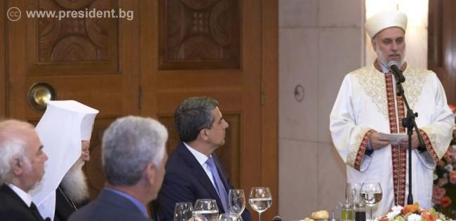 „Тази вечер сме свидетели на откровен пример за обединение на всички български граждани, който е и правилният път за утвърждаване на обичта към родината“, добави главният мюфтия, който благодари на президента Росен Плевнелиев, че постави начало на традицията държавният глава да бъде домакин на вечерята ифтар.