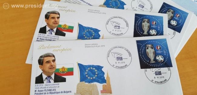 Европейският парламент отпечата пощенски плик с лика на президента Росен Плевнелиев. Това е традиция на институцията, чрез която се отбелязва участието на държавни глави в пленарните сесии на законодателния орган.