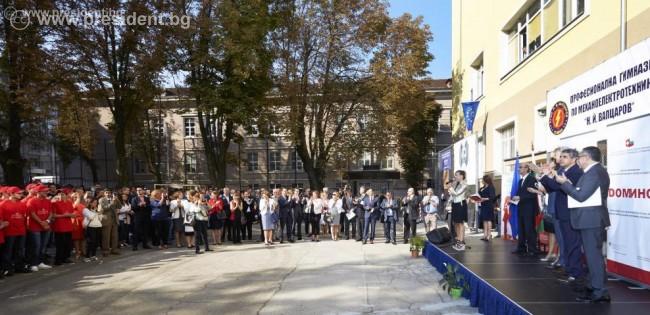 Държавният глава насърчи проекта ДОМИНО („Дуално образование за модерните изисквания и нужди на обществото“), „за една България, в която младите имат достойно място и бъдеще, имат знания и умения да направят нещо с двете си ръце и да го направят както трябва“.