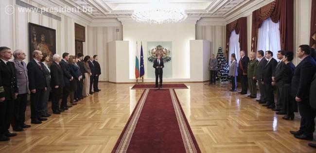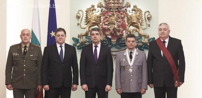 2017-01-13 16:30:00На тържествена церемония държавният глава Росен Плевнелиев удостои с висше офицерско звание и награди с висши държавни отличия военнослужещи от Въоръжените сили. Генерал Константин Попов беше награден с орден „Стара планина“ първа степен с мечове за изключително големите му заслуги за развитието на Българската армия, а бригаден генерал Боян Ставрев - с орден „За военна заслуга“ първа степен за особения му принос за развитието на Българската армия. Президентът удостои полковник Иван Ортомаров с висше офицерско звание „бригаден генерал”.
