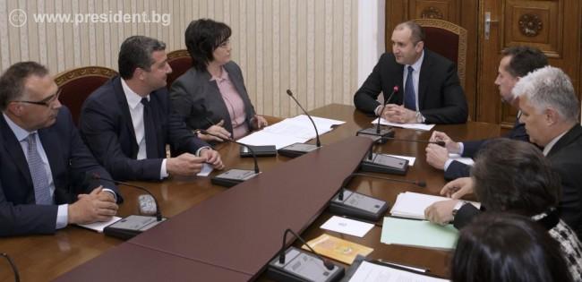 2017-04-25 16:24:00Държавният глава Румен Радев проведе консултации с Парламентарната група на "БСП за България" в рамките на конституционната процедура за връчване на проучвателен мандат за съставяне на правителство.