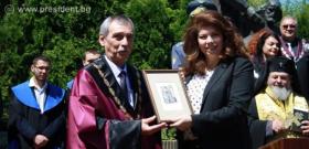 Проф. Анчо Калоянов подари на вицепрезидента том от най-новата си книга „Славянска православна цивилизация“, а ректорът проф. Бонджолов връчи на Илияна Йотова почетния знак на Великотърновския университет „Св. Св. Кирил и Методий“.