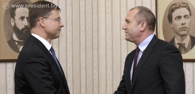 2017-06-02 14:34:00България е решена да докаже способността си да осъществява устойчиви и необратими реформи и да следва стриктно европейските политики, запазвайки икономическата си стабилност. Препоръките на Европейската комисия (ЕК) са важна отправна точка за националните политики и ни позволяват по-лесно да реализираме общите си приоритети в рамките на Европейския съюз. Това заяви държавният глава Румен Радев на среща със заместник-председателя на ЕК за еврото и социалния диалог Валдис Домбровскис на „Дондуков 2“.