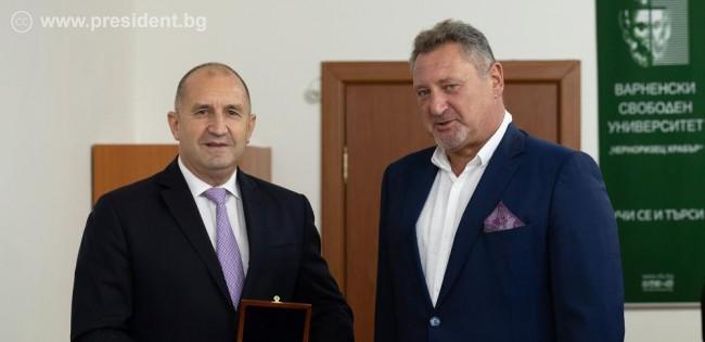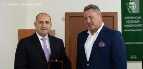 Академичното ръководство връчи на президента Радев златен плакет на Варненския свободен университет.