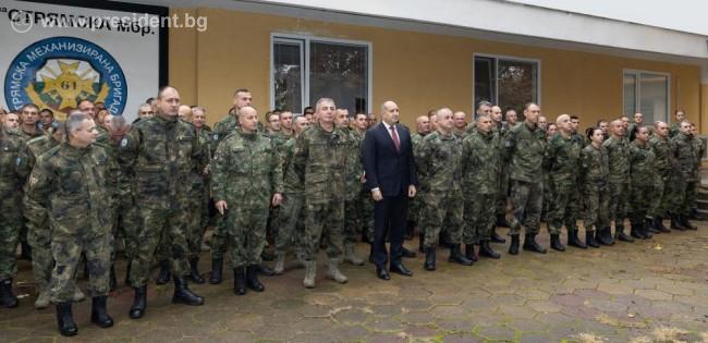 Държавният глава, който днес се срещна с личния състав на  61-ва Стрямска механизирана бригада, изказа благодарност на военнослужещите във формированието за това, че в нелеки условия  продължават с достойнство и чест да изпълняват своя дълг, да съхраняват и да развиват нови способности. Президентът изрази очакване да няма забавяне по приемането на бронираните бойни машини „Страйкър“, първите от които по договор трябва да дойдат до края на годината. Румен Радев заяви във връзка със срещата, че военнослужещите са поставили темата за промените в Закона за отбраната и въоръжените сили, които засягат отпуски, компенсации, служебно време.
