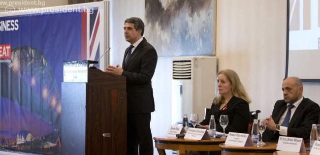 Пред представителите на повече от 60 британски компании Росен Плевнелиев очерта инвестиционните предимства на България и покани британския бизнес да бъде по-активен за реализацията на бъдещи инвестиционни проекти. „Новото българско правителство си поставя цели и приоритети, които да утвърдят България като атрактивна инвестиционна дестинация. Имаме Национална програма за развитие „България 2020“, атрактивно местоположение, отлична данъчна политика и ясна амбиция за реформи в ключови сектори и това прави страната ни перспективен пазар“, каза държавният глава пред потенциалните британски инвеститори.