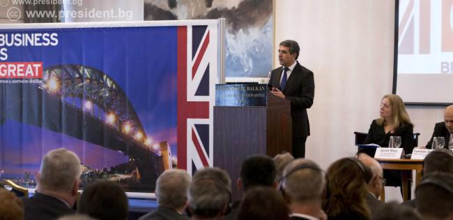 Държавният глава изтъкна, че търговският обмен между двете страни устойчиво нараства с близо 10% годишно. През 2014 г. стокообменът с Великобритания достига над 860 млн. евро. С инвестиции от 2,1 млрд. евро за периода 1996-2013 г. Великобритания се нарежда на пето място сред водещите инвеститори у нас. „Великобритания е много важен икономически партньор за България. Надяваме се страната ни да се придвижи и по-напред в класацията. Ценим всяка инвестиция от Обединеното кралство, както от големите компании, така и от малкия и среден бизнес“, каза президентът.
